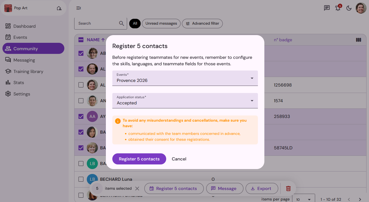 From your organization space, as an organizer, you can now add members of your community to your events yourself. This allows your contacts to be registered for your events directly by the organizers, without having to fill out the registration form.