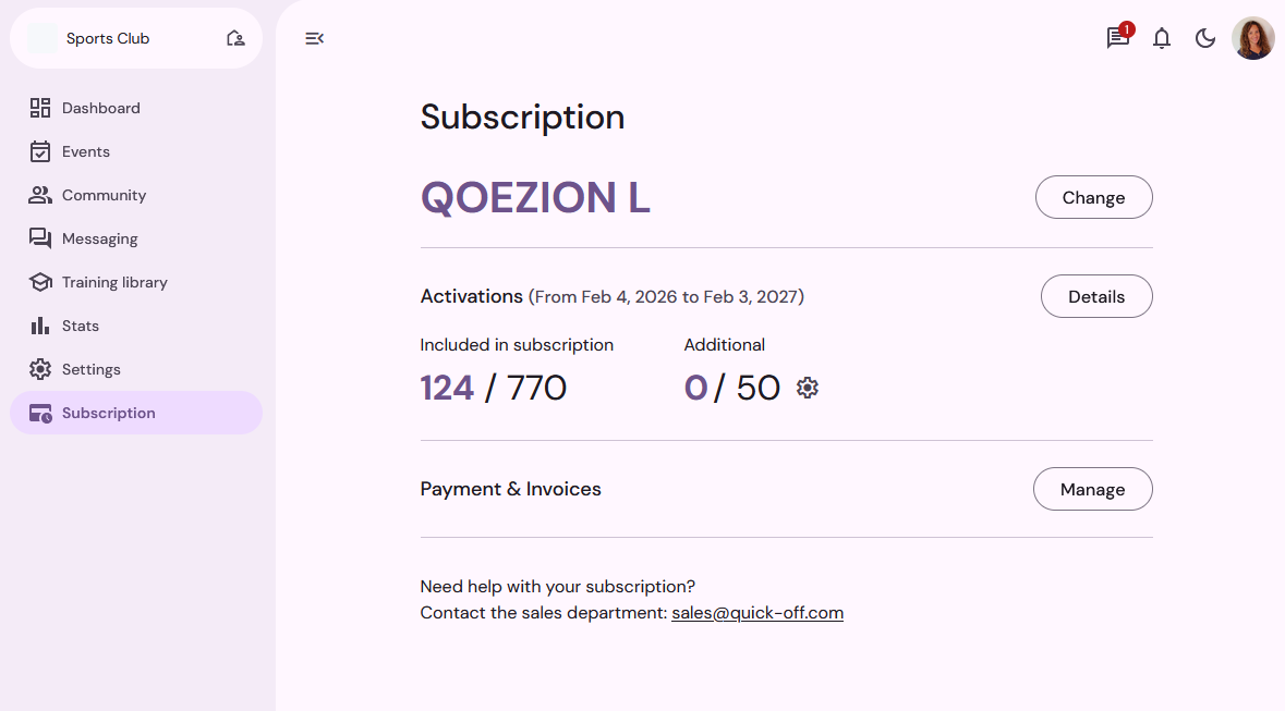 Find all the information you need to manage your Qoezion subscription on your own in your organization space. You can view the details of your current offer, including the number of activations included in your subscription and the list of activations already performed (names of accepted team mates, name of the event, and name of the user in your organization who performed the activation).